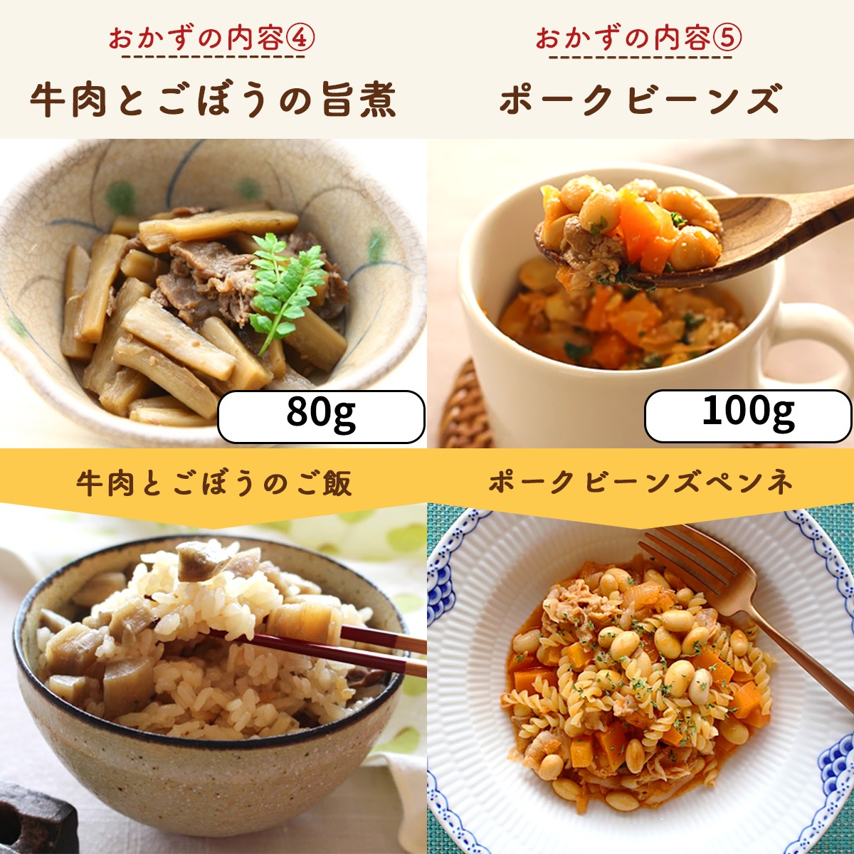 | 材料・栄養成分は、各商品ページにてご確認ください | ●鶏塩じゃが ●牛すじトマト煮込み ●和風ポトフ ●ポークビーンズ ●トマトハンバーグ ●ビーフカレー ●きんぴらごぼう ●牛肉と牛蒡の旨煮 ●懐かしソース焼きそば ●照り焼きチキン |
