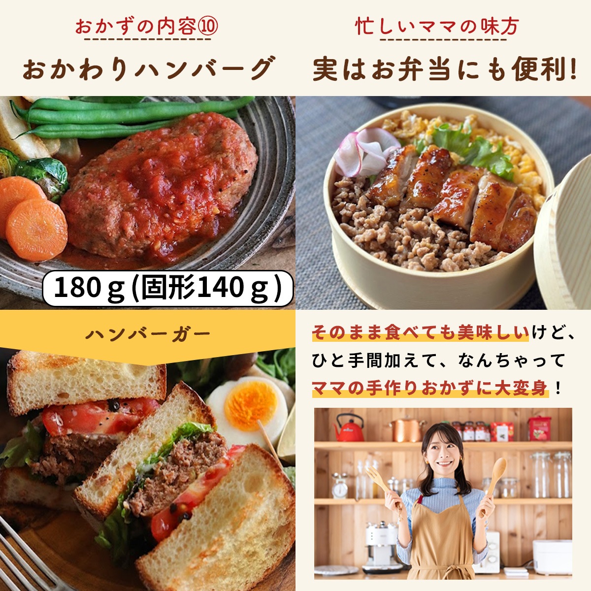 送料無料!【国産牛・国産豚のハンバーグ】 ハンバーグお試しセット 10種類×1パック (化学調味料無添加の3種類のジューシーなハンバーグと化学調味料無添加の7種類のお惣菜)