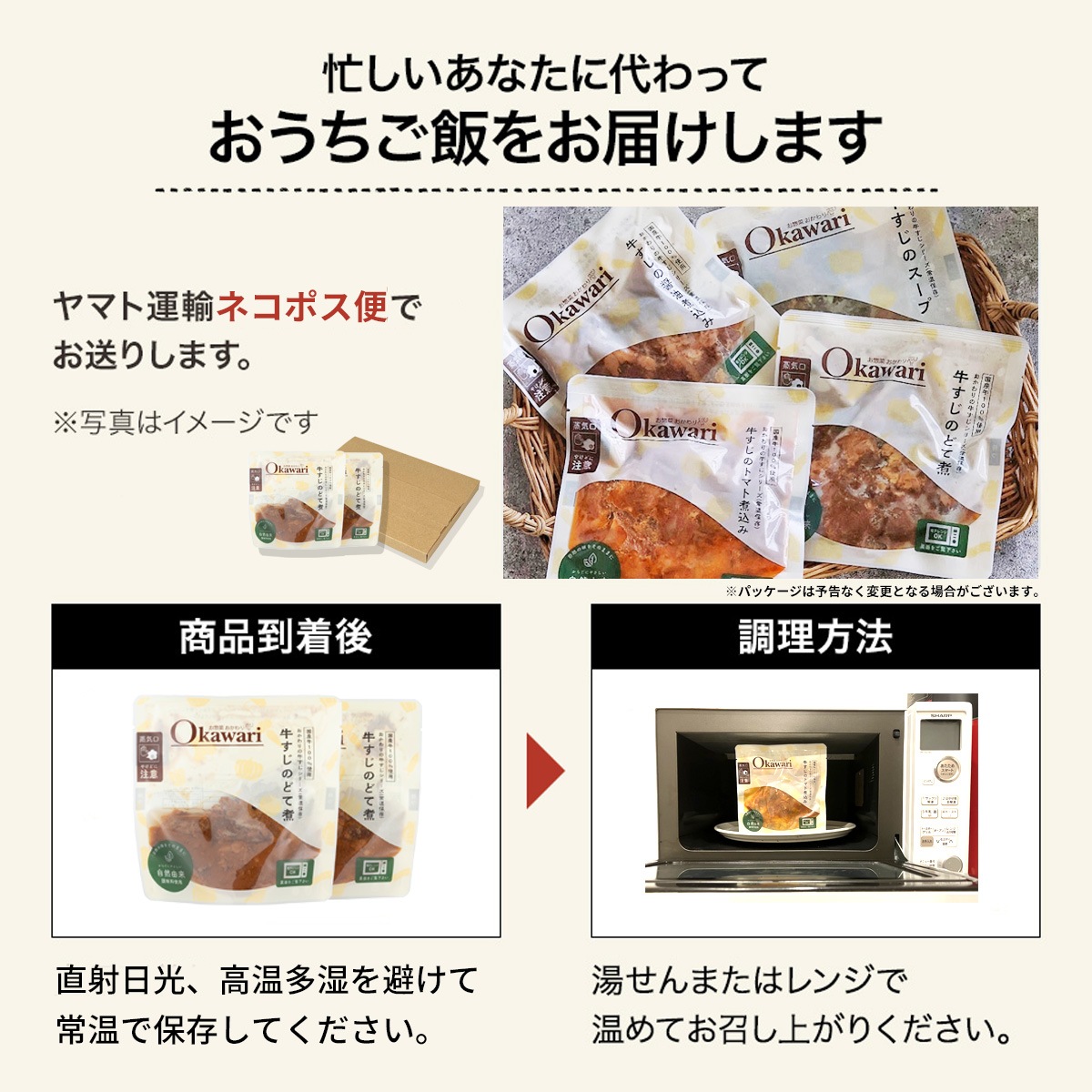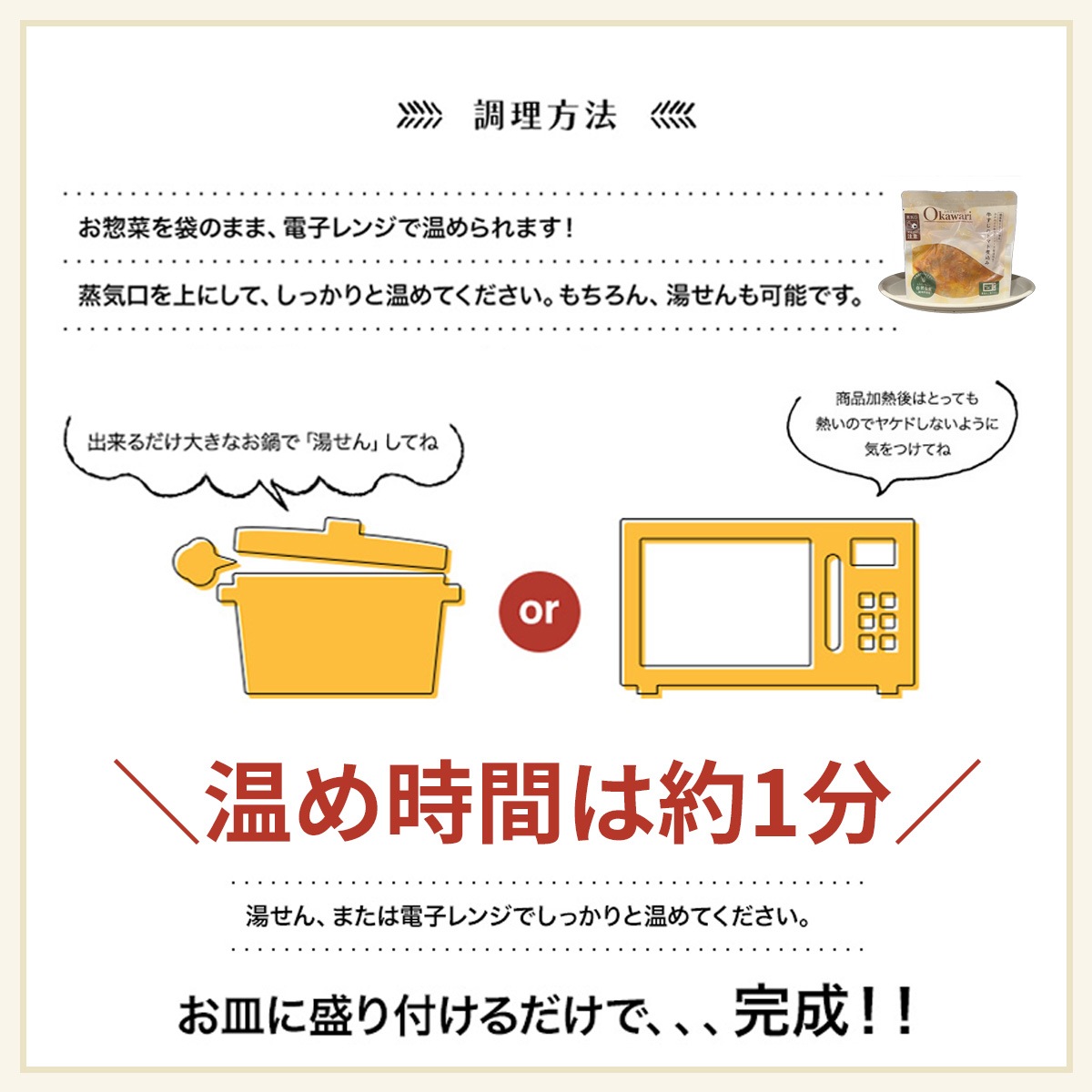 | 使用上の注意 | 電子レンジ又は湯せんにて調理してください。温め時間は商品の袋をご確認ください。 温めの際は火傷に十分ご注意下さい。 |