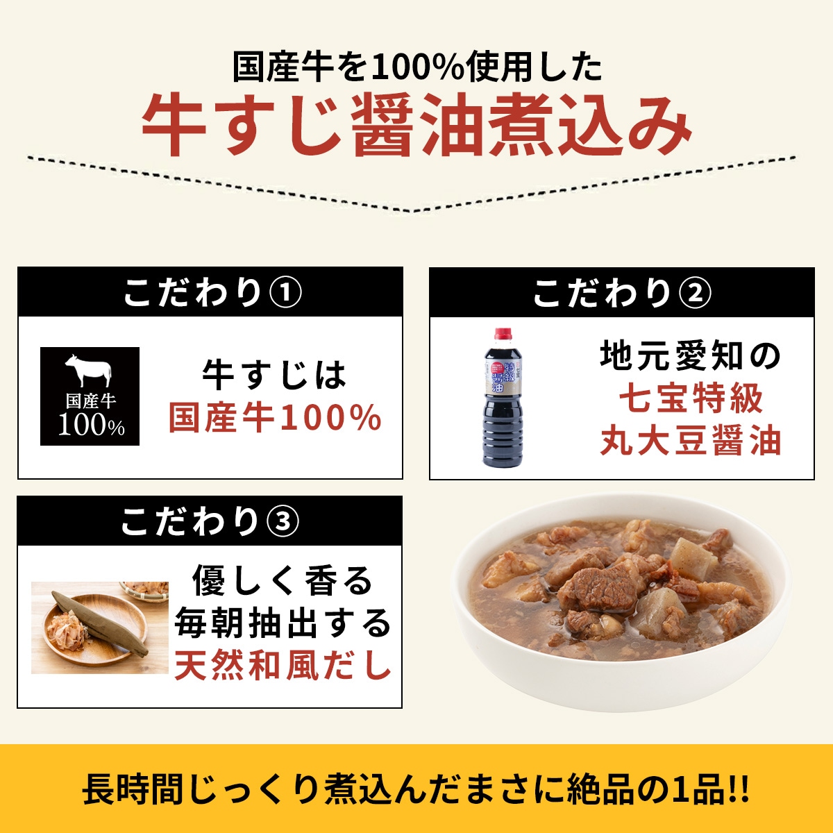 | 原材料名 | 牛すじ(国産)、和風だし(めじ削り節、厚削り節、日高昆布)、蒟蒻、清酒、醤油、みりん、砂糖、(一部に大豆・小麦・牛肉を含む) |