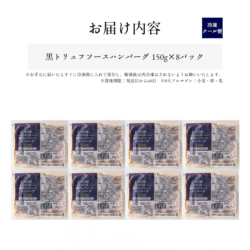 | 原材料名 | 牛肉(オーストラリア)、たまねぎ、つなぎ(パン粉、全卵、でん粉)、粒状植物性たん白、牛脂、牛乳、しょうゆ、食塩、ガーリック、しょうが、香辛料/トレハロース、調味料(アミノ酸等)、リン酸塩(Na)、焼成Ca、ソース(赤ワイン、野菜ソテー(たまねぎ、にんじん、ラード)、牛脂、ホワイトルウ(小麦粉、なたね油)、トマトペースト、ぶどう糖果糖液糖、オニオンエキス、砂糖、ミルポワペースト、トマトケチャップ、バター、ビーフブイヨン調味料、ビーフエキス調味料、ビーフエキス、食塩、トリュフ、香辛料/増粘剤(加工デンプン)、カラメル色素、調味料(アミノ酸等)、香料)、(一部に小麦・卵・乳成分・牛肉・大豆・鶏肉・豚肉を含む) |